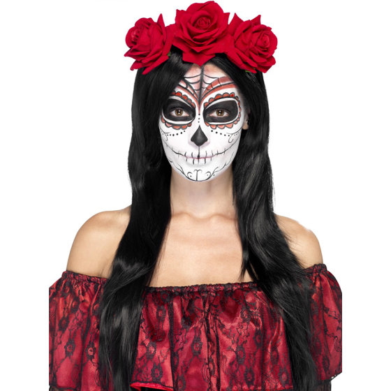 Cvjetni rajf s tekstilnim crvenim ružicama, za tematsko Sugar Skull/Day of the Dead maskiranje.